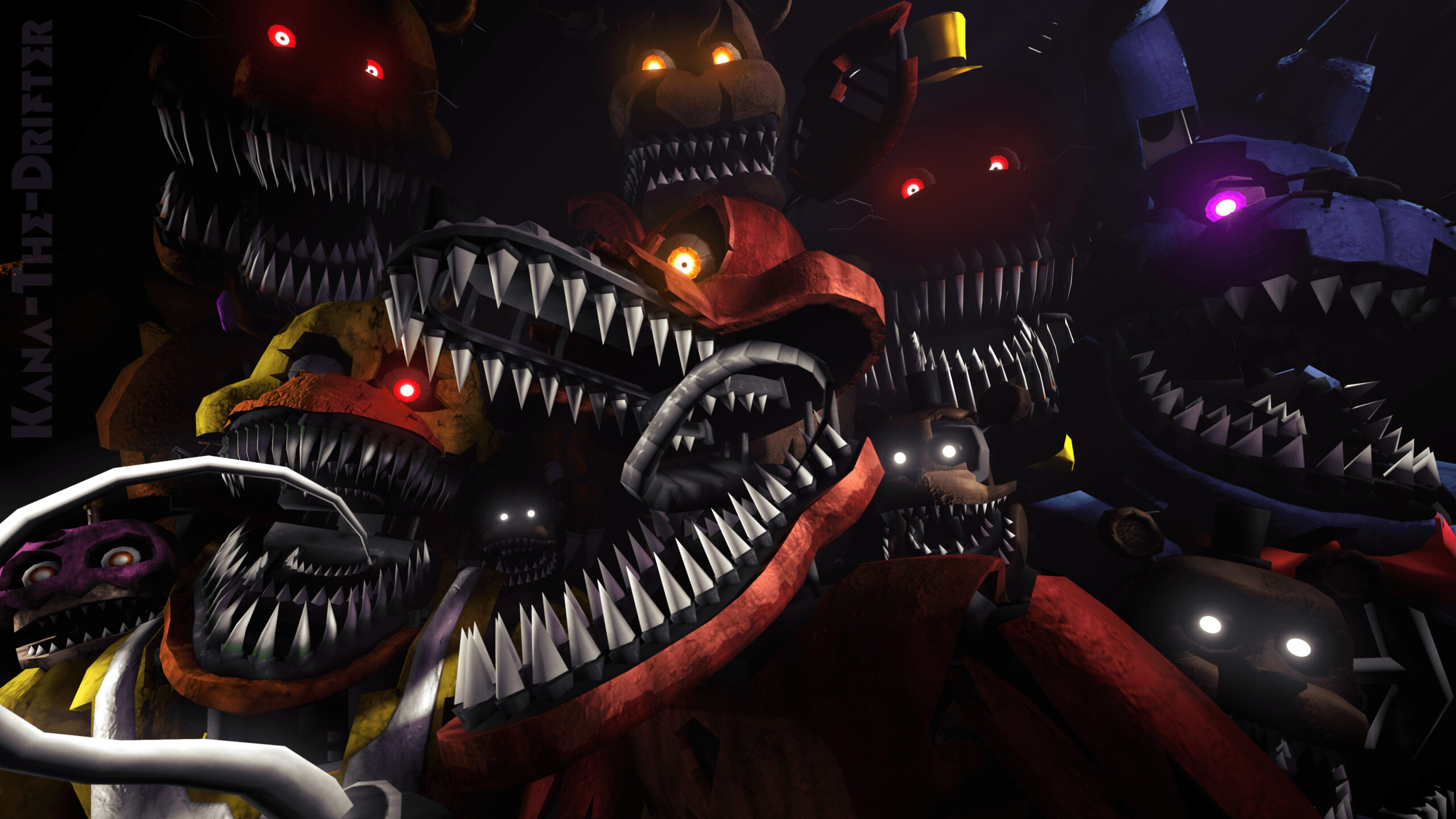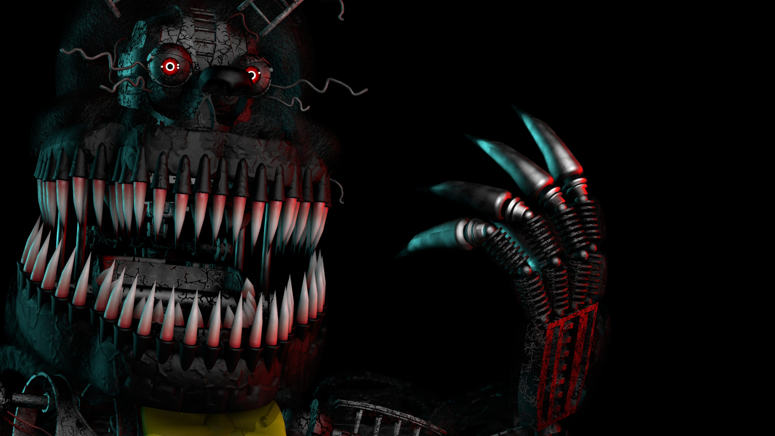 Nightmare Fredbear:今まで名前のみの登場だったFredbearの名を冠する、初めてのキャラクター。どのNightmareシリーズよりも鋭い牙を持つ。さらに赤く爛々と輝く目があり、他の機械人形達とは一線を画す存在であることが伺える。 外見的な最大の特徴としては、腹部についた大きな口が挙げられ、こちらにも鋭い牙が生え揃っている。