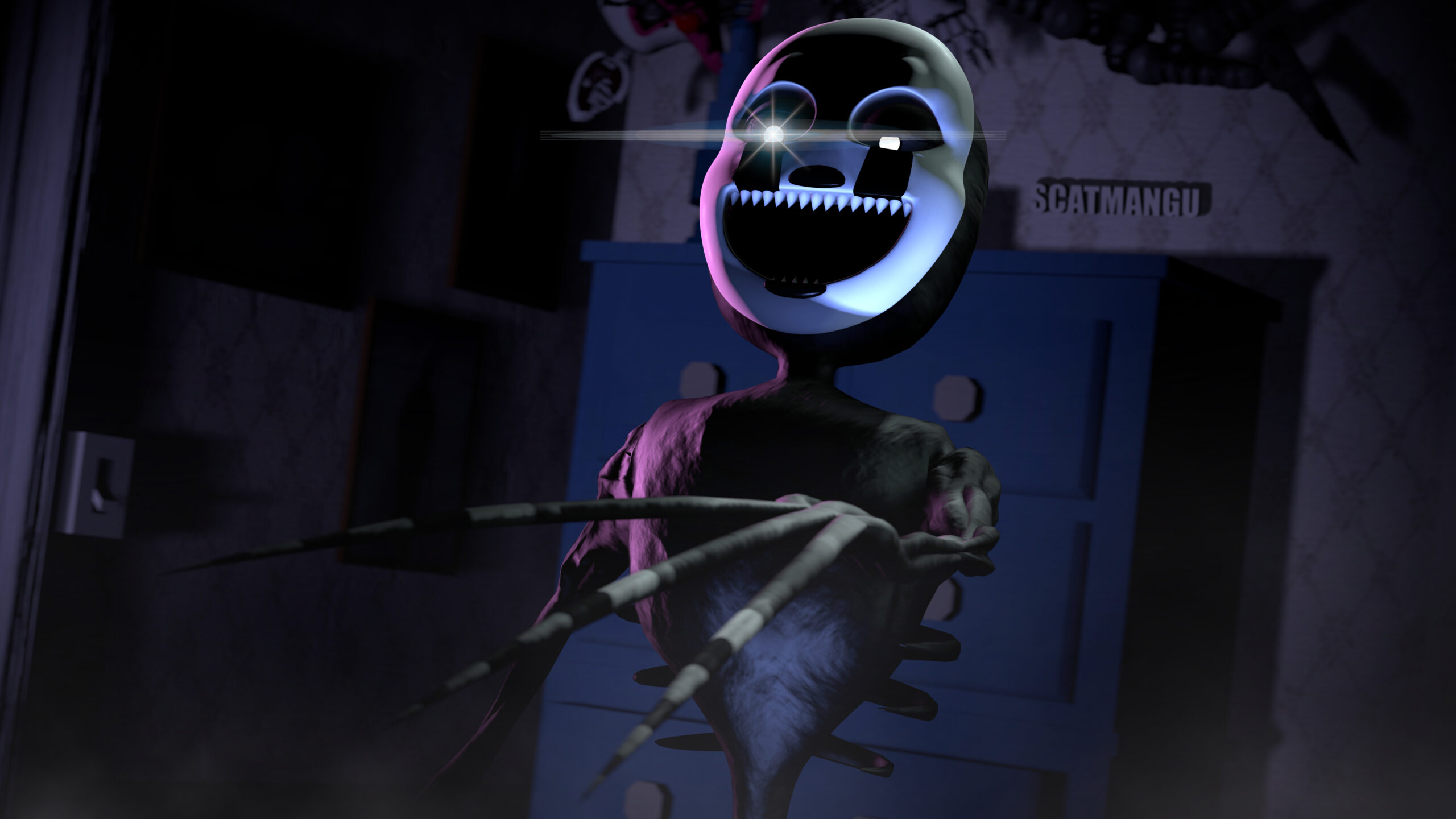 Plushtrap:ぬいぐるみにしては、物騒すぎる歯がたくさん並んだ口を持っており、まるで口裂け女のように顔の両端まで伸びている。開いた口からは、2つ目の顎が見えており、内骨格のようなものが入っている可能性が高い。FNaF2などで登場したぬいぐるみと比べても、外観はアニマトロニクスに近いものであるため、Freddlesのような、小型アニマトロニクスと思われる。ボディは少し薄汚れており、耳などが少し欠けている。